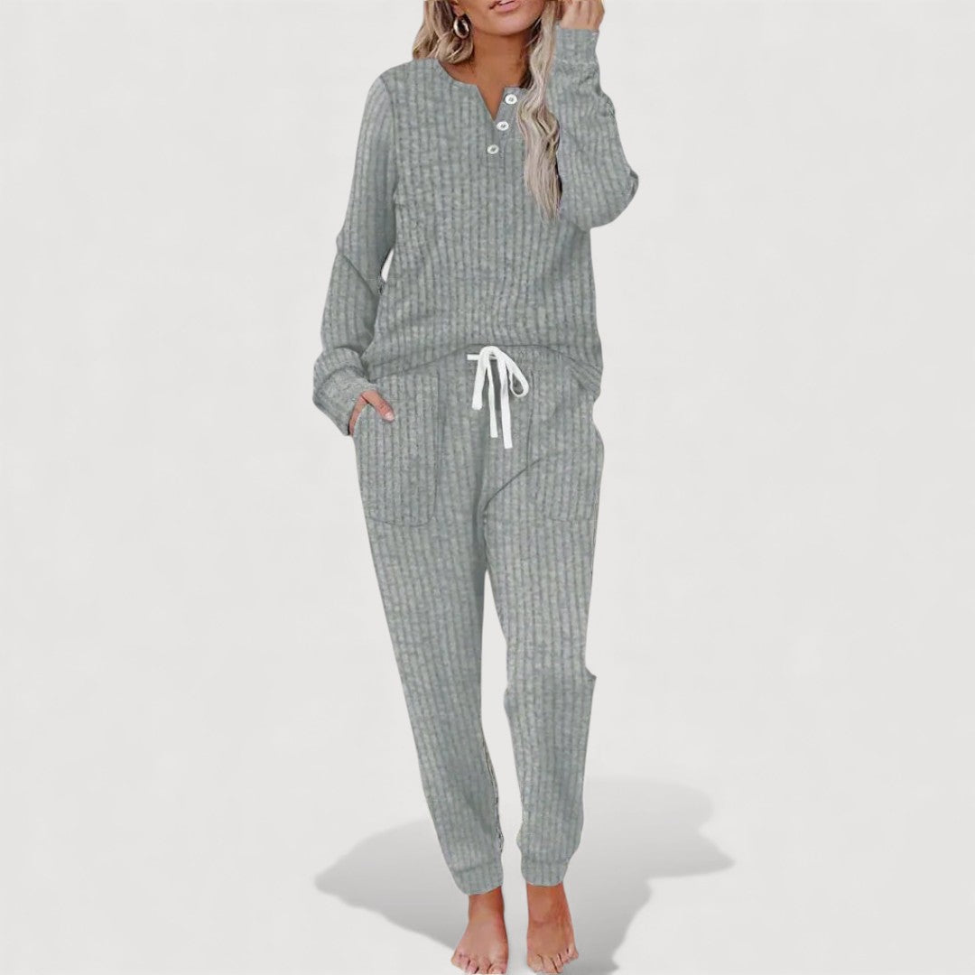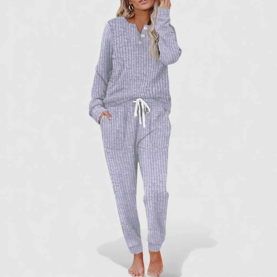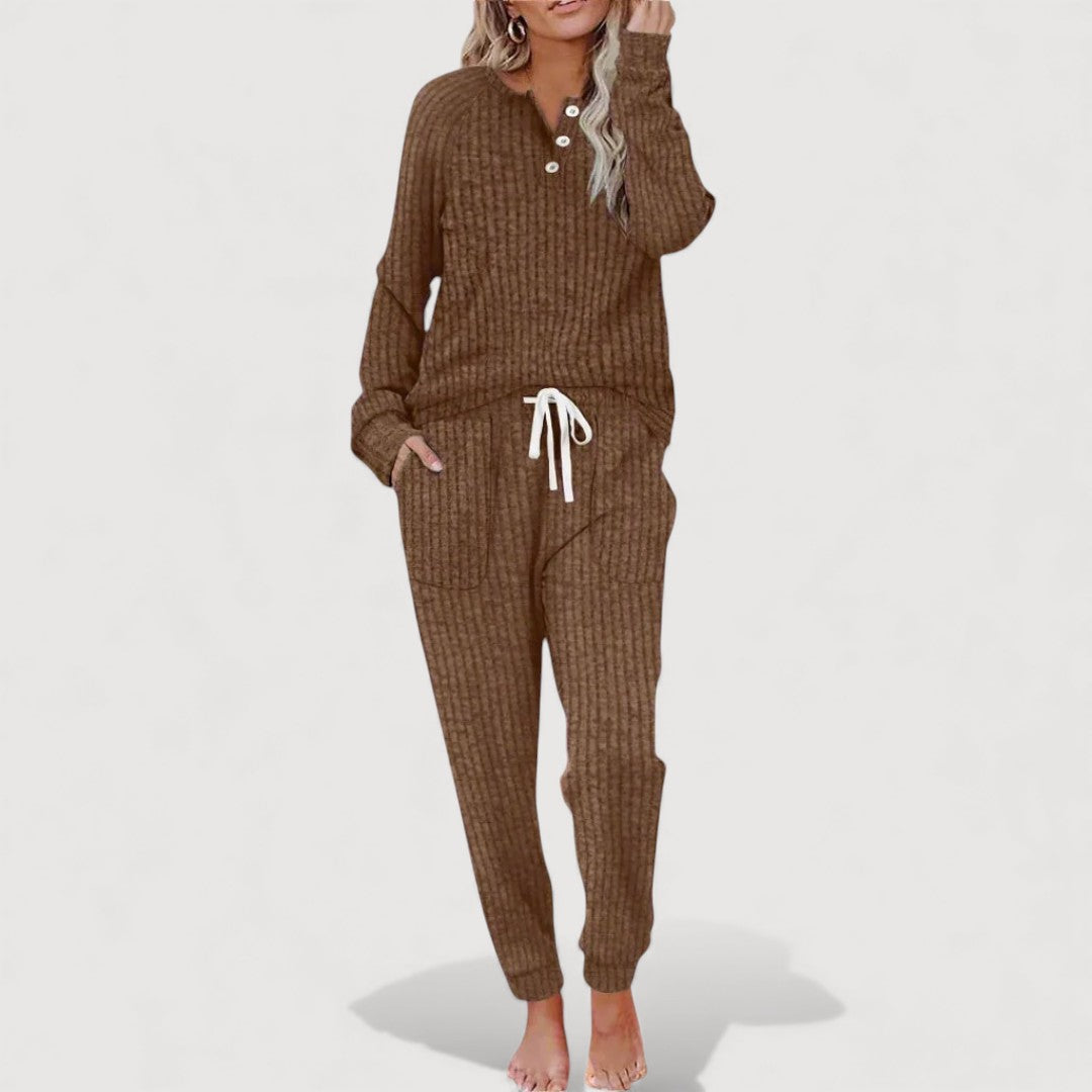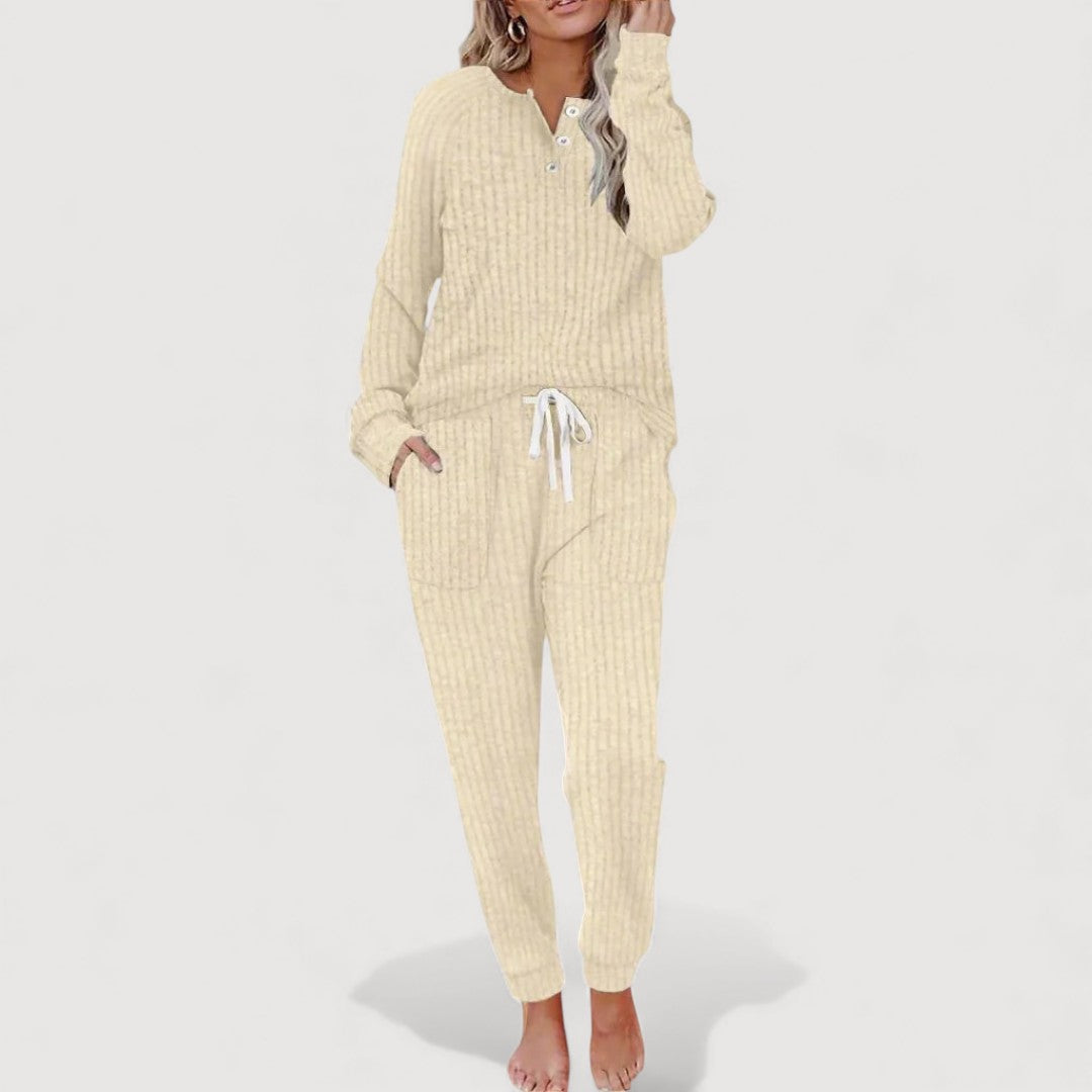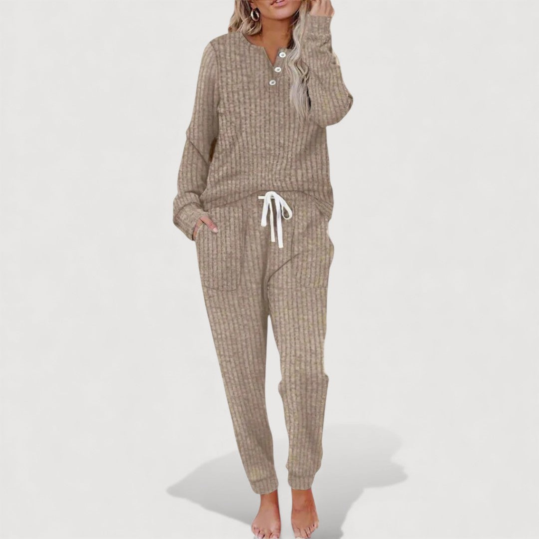 Sol Lounge Set is designed for relaxed days when comfort and effortless style matter most. The softly structured top pairs beautifully with matching trousers, creating a coordinated look that feels easy yet put-together. Thoughtful details allow freedom of movement while maintaining a flattering, grown-up silhouette. Ideal for quiet mornings at home or casual days out, this set quickly becomes a wardrobe favourite.